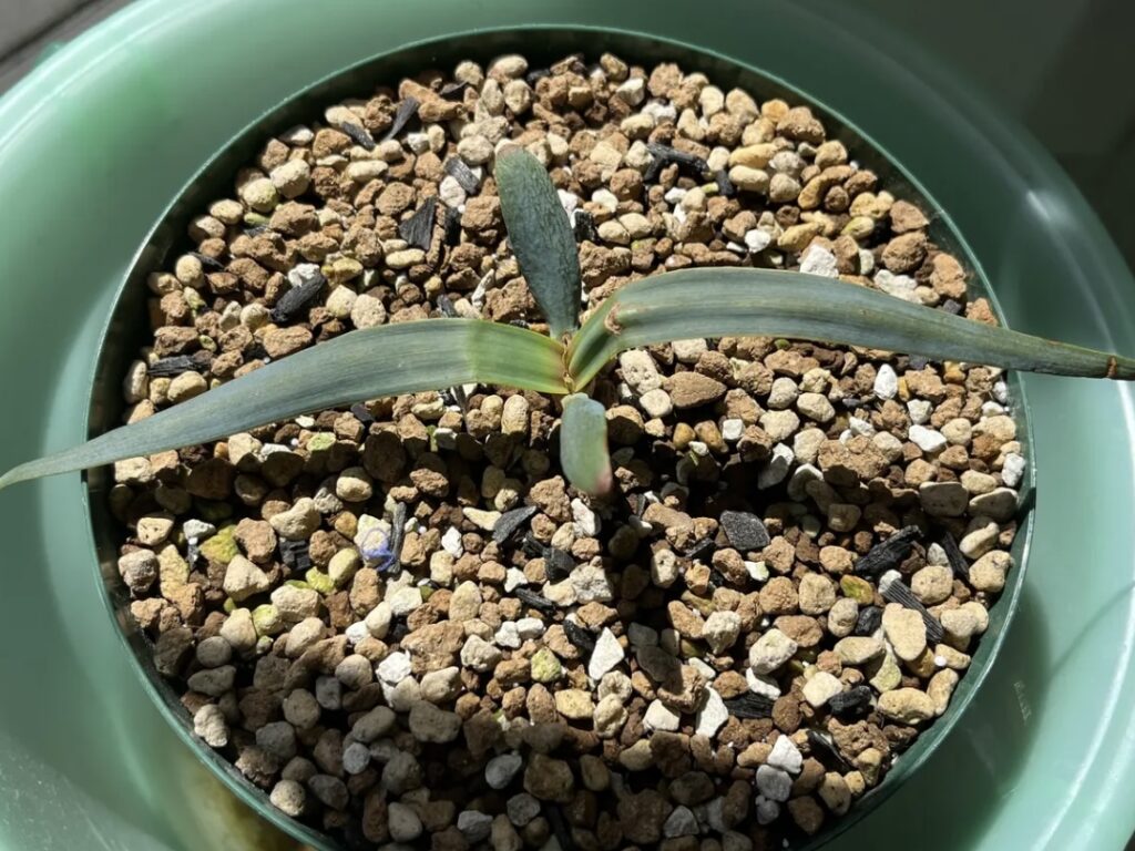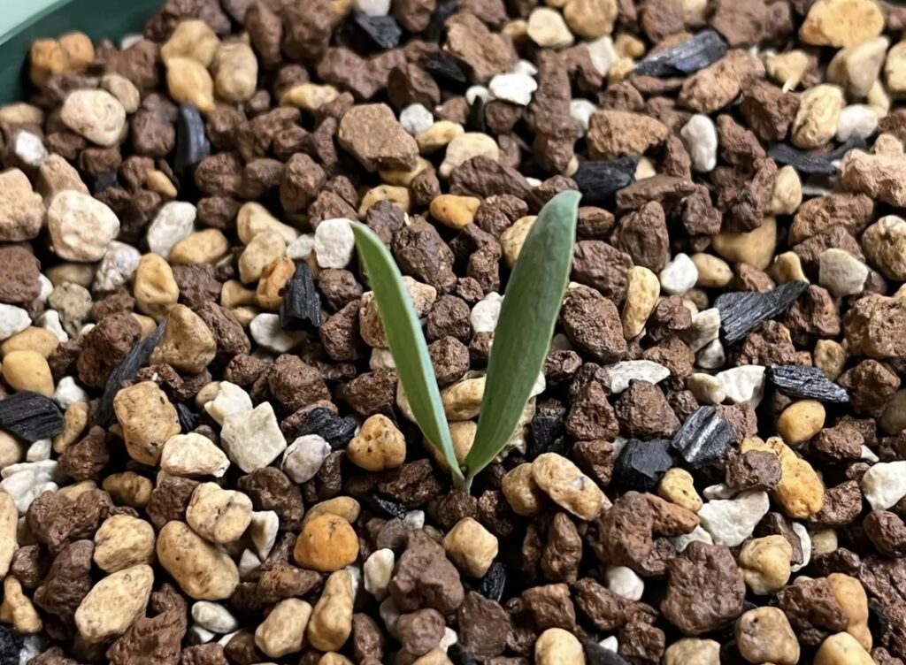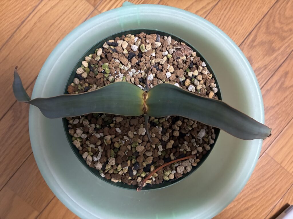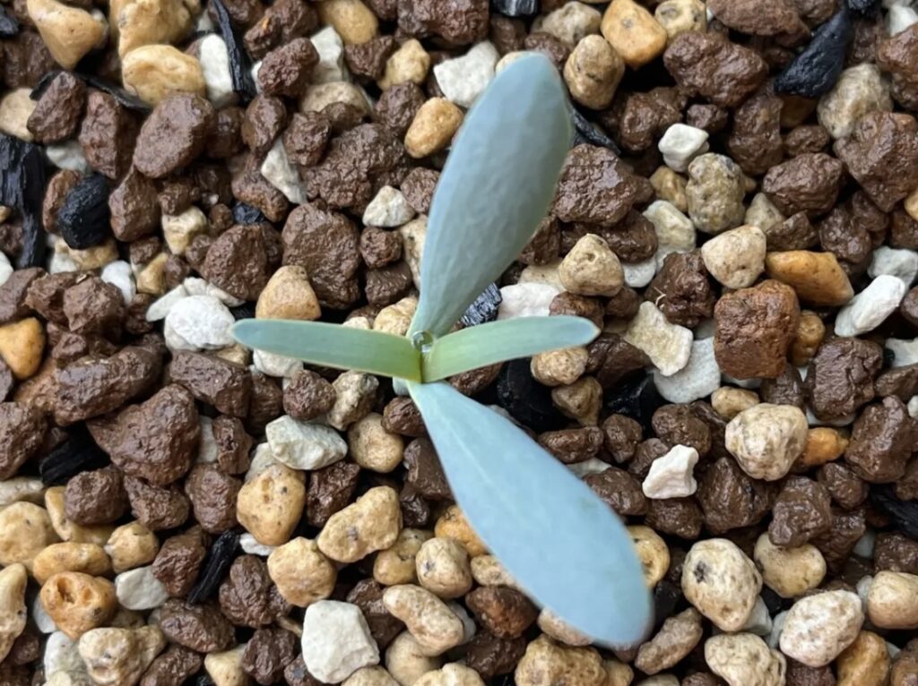 本葉が出てきました。キソウテンガイはこの2つの本葉が生涯伸び続けるみたいです。(2024/8/13)